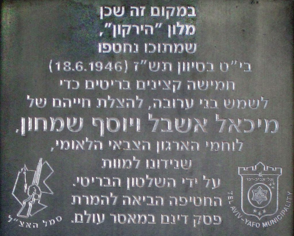 מעשה החטיפה הראשון התרחש ביוני 1946, בתגובה לעונש המוות שהוטל על מיכאל אשבל ויוסף שמחון, אשר השתתפו במתקפה על המחנה הצבאי הבריטי שבצריפין. במהלך מבצע חטיפה זה, חטפו חברי אצ"ל חמישה קצינים בריטיים במועדון "הירקון" שבתל אביב, בדרישה לביטול עונש המוות בעד שחרור הקצינים. תחילה, הוטל עוצר על תל אביב, והבריטים, ביחד עם העיריה ועם נציגים מן הישוב היהודי, קראו בתוקף לשחרור הקצינים. האצ"ל סירבו, וטענו כי יסכימו לשחררם רק במילוי אחר התנאים שהציבו. ואכן, הקצינים שוחררו כתגובה להמרת הנציב העליון את עונשם של אשבל ושמחון למאסר עולם.