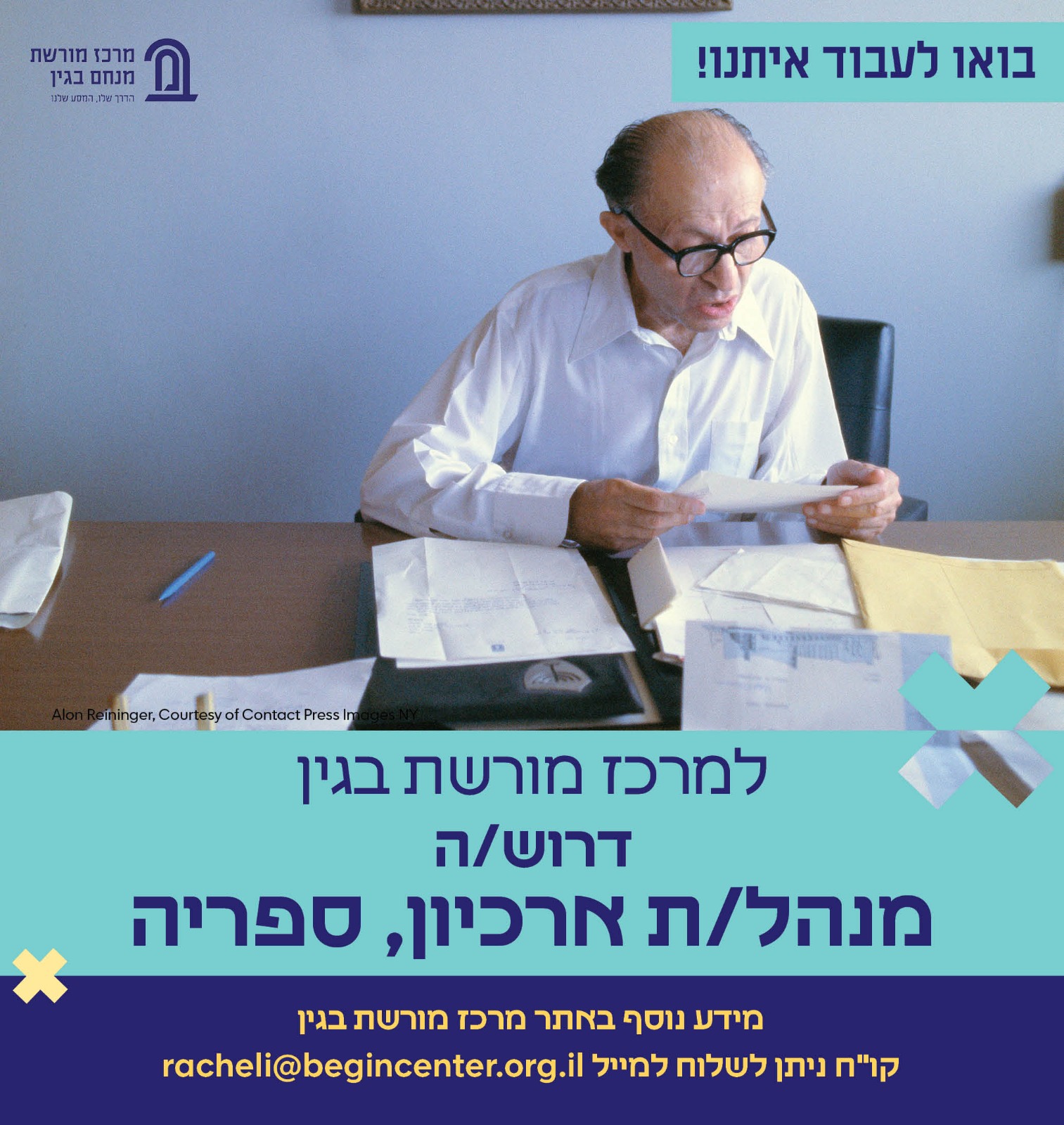 ארכיון מרכז בגין פועל למעלה מ-25 במטרה לאסוף, לשמר ולהנגיש את המכתבים, הנאומים, התצלומים וקטעי הארכיון של מנחם בגין. אנו מחפשים את מנהל/ת הארכיון הבא/ה של מרכז מורשת בגין בעל/ת ניסיון בניהול ארכיונים, יכולת הובלה מקצועית והיכרות עם טכנולוגיות בתחום. התפקיד כולל אחריות על פיתוח ארוך-טווח של הארכיון, שיפור תהליכי העבודה, והנגשת חומרי הארכיון לקהלים שונים בארץ ובעולם.