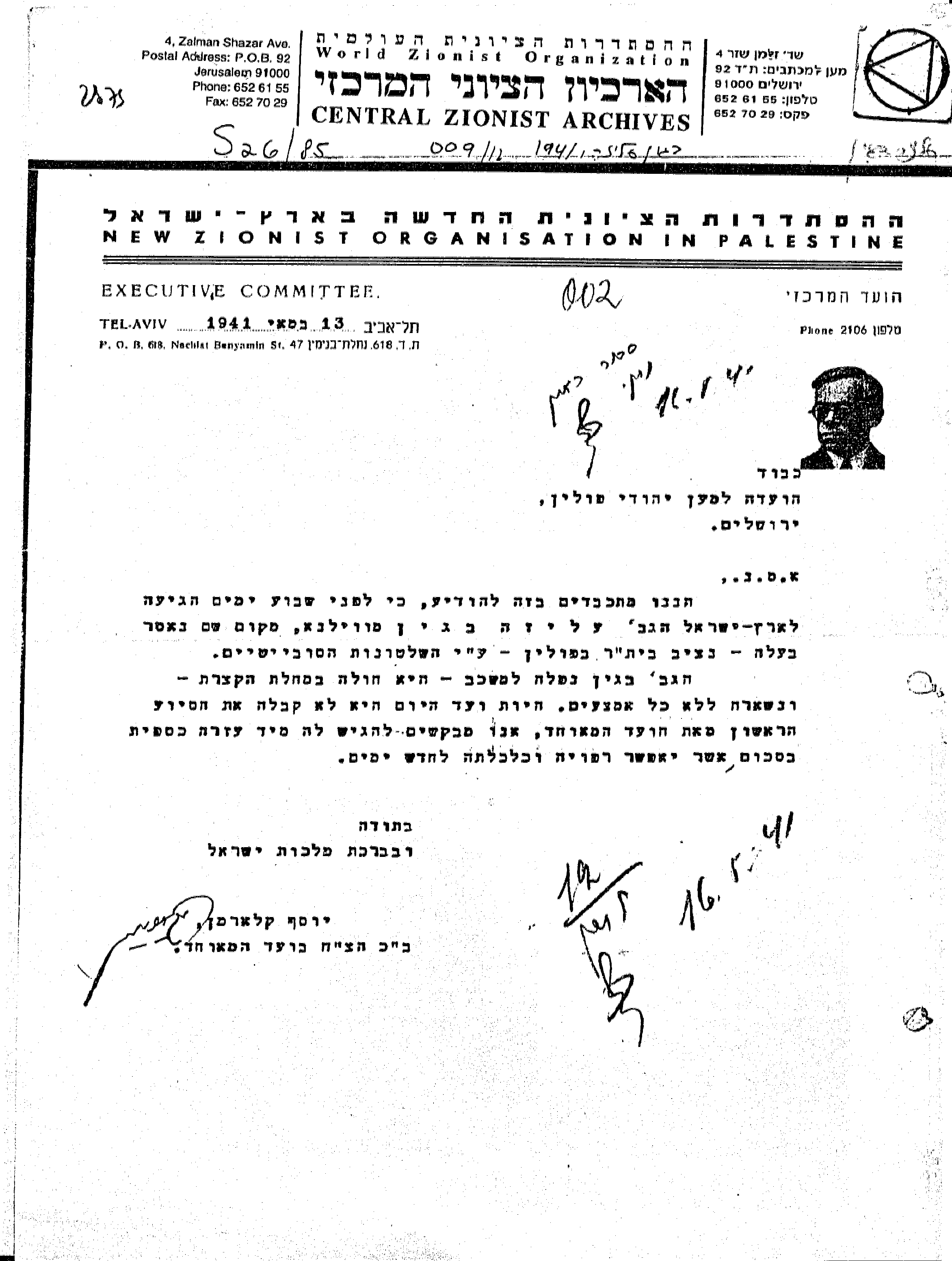 | מכתבו של יוסף קלארמן לוועדה למען יהודי פולין בנוגע לבקשת סיוע לעליזה בגין שהגיעה לפני שבוע לארץ ונפלה למשכב